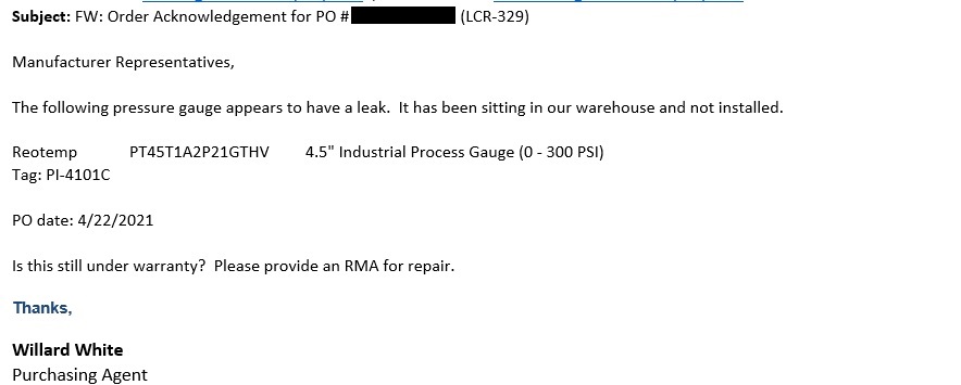 Once when I was rummaging through a box of field equipment which contained pressure transmitters and pressure gauges. One of the pressure gauge boxes was disfigured by fluid leakage. Since everything else in the box was dry, I opened the box and noticed the box interior had also absorbed fluid and the bubble in the pressure gauge was considerably larger than expected. To determine if the bubble was actually larger than expected, the gauge was compared with the other boxed gauges. Knowing the device would eventually be installed, I brought the possible fill fluid leakage to the project manager to be aware of the issue and get confirmation to begin repair before installation. The initial step selected for this issue was to contact the supplier. Since the supplier has a workbench set up to handle pressure gauges, it was most likely the supplier would request the gauge in their facility instead of returning to the manufacturer. The supplier, who is the manufacturer representative, is just as interested in what caused the leakage (bad plug? Incorrectly installed or a case manufacturing issue?) as they are in getting the device repaired.