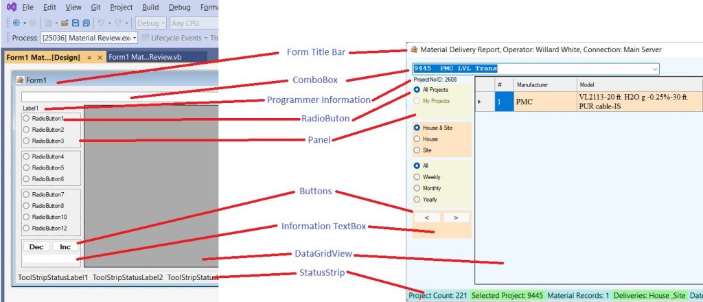 Detail 1 is a Designer view and a running of the Material Delivery Report. The focus here will be the operation of the RadioButton and how they function when grouped in a Panel. Note that a GroupBox is an option also and differs from a Panel as a GroupBox has a title and a visible outline when the program is running. Correspondently, the interior of both can be backcolored.